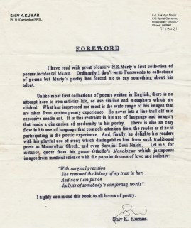 Prof. Shiv K Kumar’s Foreword to Incidental Muses